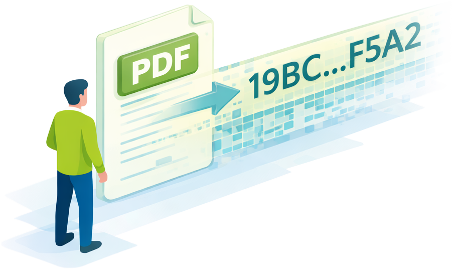 Ein sog. Hashwert wird zu diesem Dokument berechnet. Dazu wird der Algorithmus SHA3-256 verwendet. Bei diesem Wert handelt es sich um eine Zeichenabfolge, die wie ein Fingerabdruck des Dokuments wirkt und sich ändert, sobald eine Änderung am Dokument gemacht wird. Wenn der Hashwert unverändert ist, kann sich auch an dem Dokument und seinem Inhalt nichts geändert haben