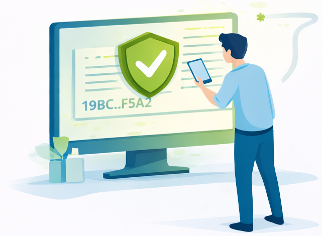 Das Dokument kann nun über die Webanwendung check.cert4trust.de überprüft werden. Die Anwendung berechnet den Hashwert zu einem Dokument, nachdem dieses in die Anwendung geladen wurde. Bei der Überprüfung wird die Blockchain gescannt und mit dem in der Webanwendung ermittelten Hashwert des Dokuments verglichen. Wurde ein digitales Dokument nicht von einem teilnehmenden Partner ausgegeben oder nachträglich geändert, kann kein passender Hashwert gefunden werden.